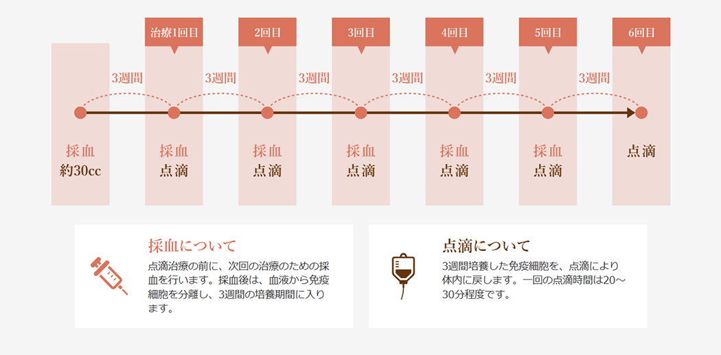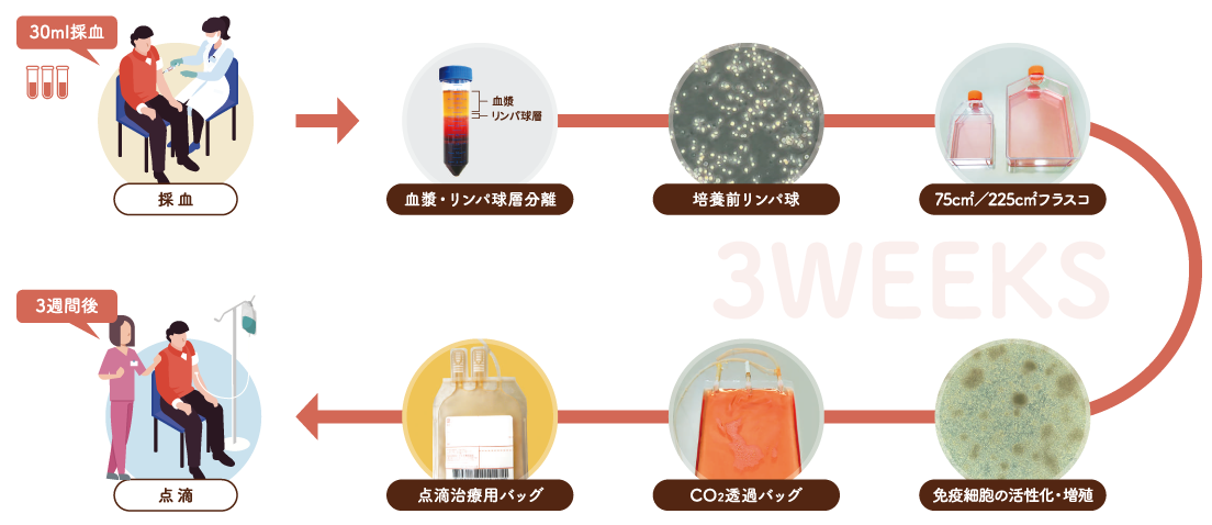 培養期間が必要ですので、採血してから実際の治療(点滴投与)までに、約3~4週間程度かかります。