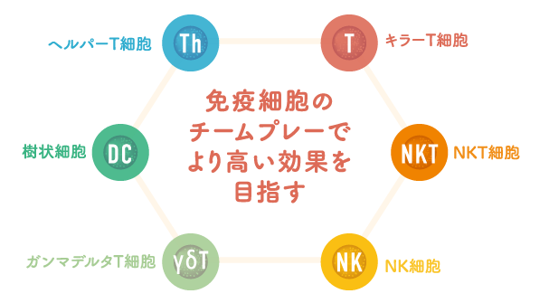 6つの免疫細胞が一丸となって「チームプレイ」で働き、がん細胞を多方面から特異的に攻撃