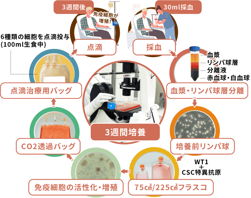 治療が決定したら、まずは患者様の免疫細胞を確保するために、採血を行います。3週間後、培養により活性化・増殖した免疫細胞を、患者様の体に点滴で戻します。